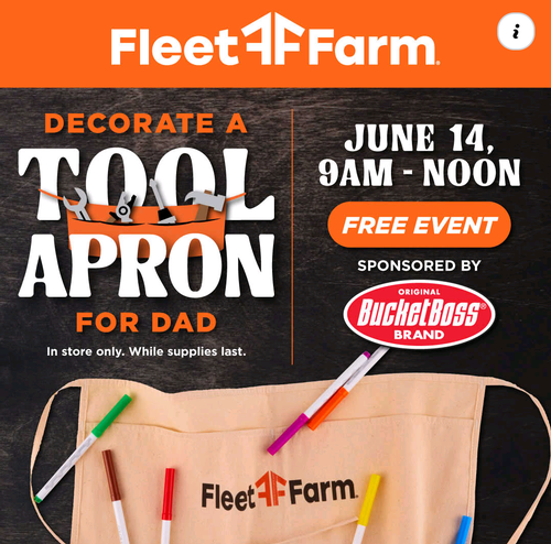 Come to Fleet Farm and decorate a tool apron for dad just in time for Father's Day!